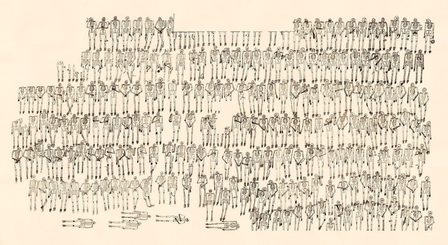 I know, this sounds like the inspiration for that 300 movie, but it isn’t (I know, I’m also confused). The illustration above is from their grave, found in 1880. You can even see some of them holding hands.